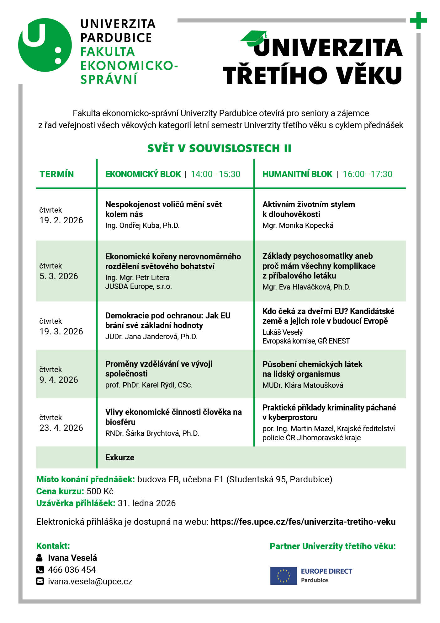 Chtěli byste se dozvědět něco nového a rozšířit si své znalosti? V tom případě jste tu správně. Na každém setkání bude populárně naučnou formou představeno jedno téma z ekonomie, které doplní další z oblasti společenských a humanitních věd. Vystoupí nejen vysokoškolští pedagogové, ale rovněž odborníci z praxe, se kterými fakulta dlouhodobě spolupracuje. Přednášky jsou určeny nejen seniorům, ale i zájemcům z řad veřejnosti všech věkových kategorií.