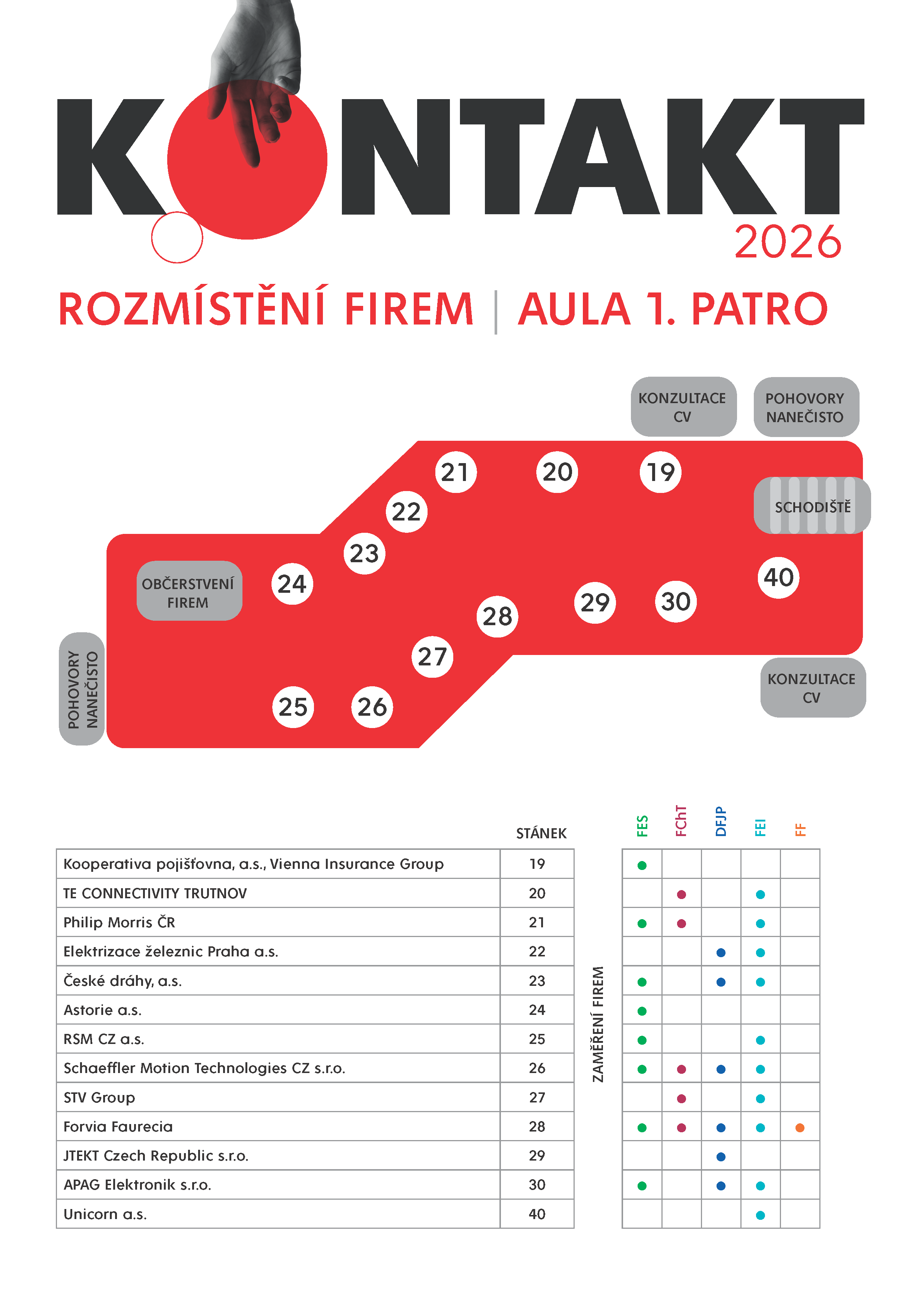 KONTAKT 2026 je veletrh pracovních příležitostí pro studenty a absolventy Univerzity Pardubice. Je založen na osobním kontaktu mezi studenty a zástupci firem a odehrává se přímo v prostorách Univerzity Pardubice. KONTAKT 2026 nabízí studentům aktuální pracovní pozice, stáže a brigády, konzultace životopisů, pohovory nanečisto i různé soutěže.