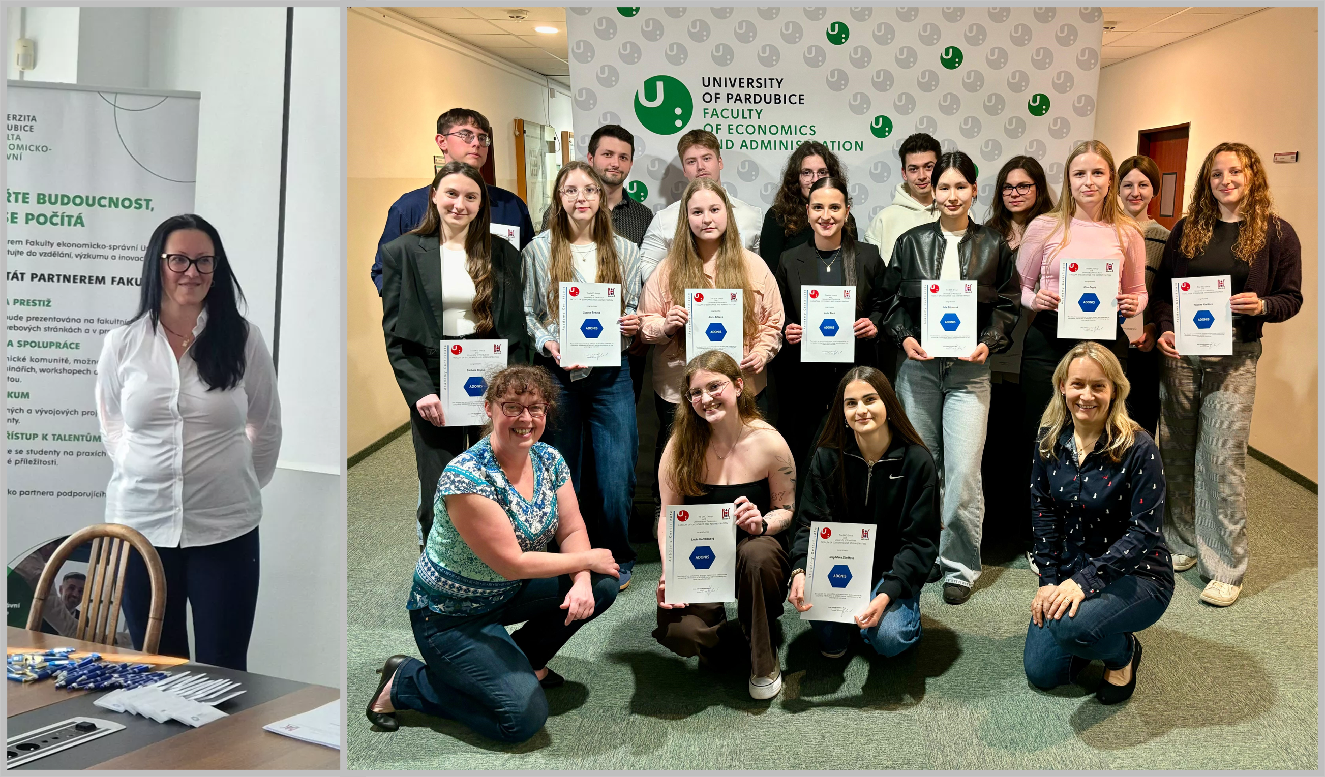 Dne 15. dubna 2026 proběhlo slavnostní předání certifikátů ADONIS, které mohou získat nejúspěšnější studenti a studentky předmětů Základy informačních systémů a Informační systémy. Certifikát se váže k nástroji společnosti BOC Group, jenž slouží k modelování a dokumentaci procesů a jejich propojení s informační architekturou organizace.